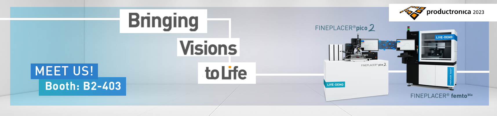 During Productronica 2023, Finetech will present state-of-the-art die bonding equipment, including the FINEPLACER® femtoblu, FINEPLACER® pico 2, and FINEPLACER® femto 2, each designed to meet specific needs in photonics production, lab research, and advanced automated sub-micron bonding.