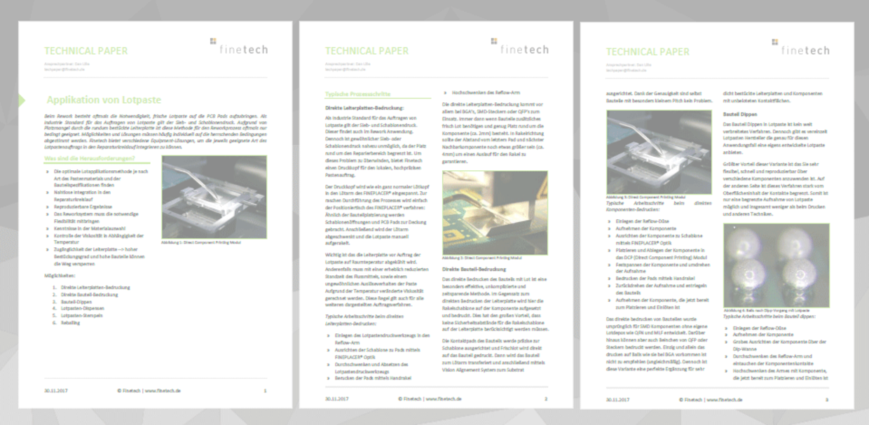 摘要: 返修SMD元器件往往需要在PCB焊盘上施加新的锡膏。工业标准是丝网和钢网印刷,但是由于密集的PCB板空间有限,这种方案并不适用于所有情况。可行的解决方案往往需要根据当前的条件单独定制。Finetech可以在整个返修过程中提供多种不同的锡膏施加解决方案。