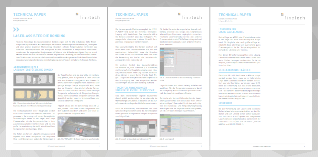 摘要: Finetech激光辅助键合技术用于对速度、精度和局部甚至非常小区域的精确加热控制有高度需求的场合,例如芯片到热沉(C2S)、芯片到晶圆(C2W)键合。尤其是快速温度循环可减少表面氧化的风险,并缩短时间优先的生产环境中的工艺周期。在有序的基板级或晶圆级键合工艺中,每颗芯片只能被加热一次。与区域加热相反,激光局部加热不需要额外的措施避免热膨胀。芯片可以在仅500微米间距情况下键合,相邻的焊点不会出现(重新)融化的现象。
