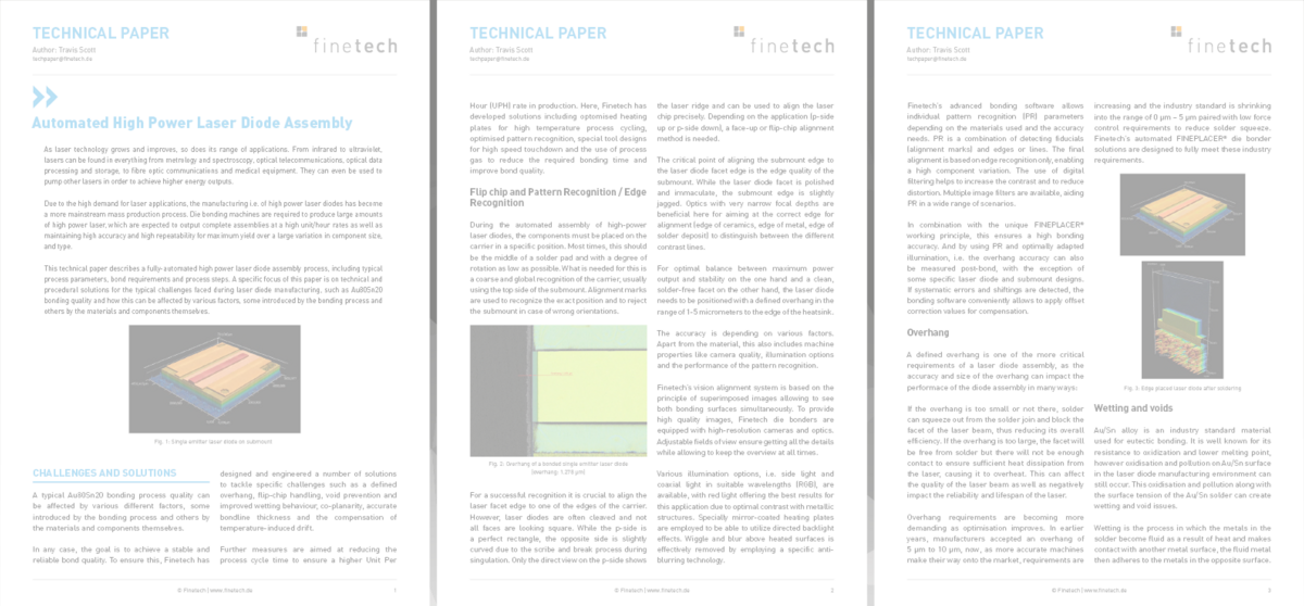 本文描述了高功率激光二极管的全自动组装工艺。包括技术工艺参数,贴片要求和工艺步骤。这里特别详细的关注了技术和工艺解决方案以及生产中所面临的典型挑战。例如Au80Sn20金锡共晶焊的质量问题以及影响焊接质量的诸多因素。有些取决于贴片工艺,还有一些则跟材料和芯片自身相关。